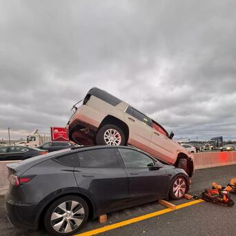 无特有偶,就在圣诞节前,在好意思国加利福尼亚州奥兰治县,一辆玄色雪佛兰撞到了一辆白色 Model Y,终末也左摇右晃地落在了特斯拉的车顶上。这次事故中,电动车的车顶相似出色地承受住了撞击。此外,还有一辆红色丰田 GR 卡罗拉和一辆银色当代汽车也卷入了这次碰撞事故。外媒臆想是不是 SUV 车尾的零散打算在某种进度上起到了陡坡作用,让 SUV 能松驰滑到 Model Y 车顶上,而且商酌如若是相似尺寸但车尾更耸立的 SUV,是否会碰到相似情况。