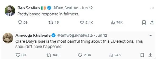 对于戴利这一讲演,在RTE这条帖文下方,有不少网友向她抒发救助,“自制地说,这是很合理的讲演。”“克莱尔·戴利的失利是这次欧洲选举中最凄沧的事情。这不应该发生。”↓