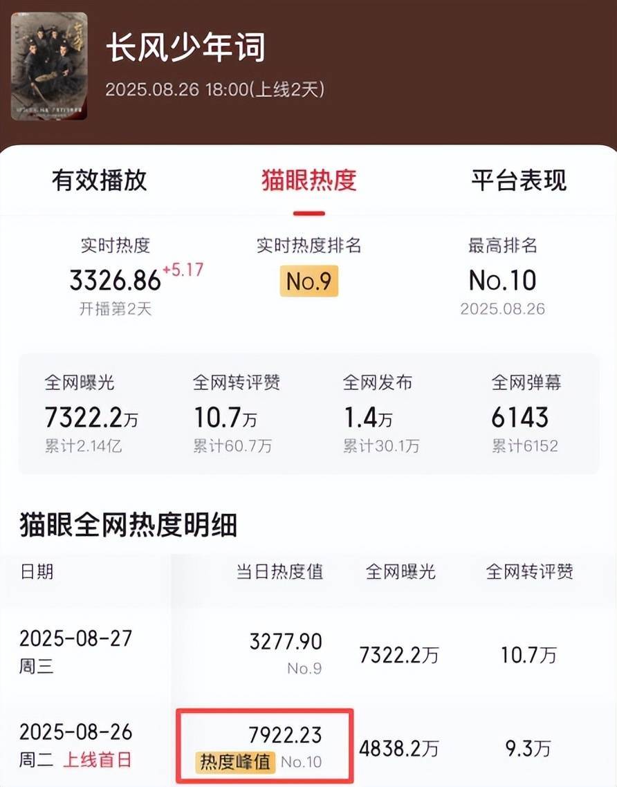 《长风少年词》上线芒果TV,仅播4集热度放肆破7900。