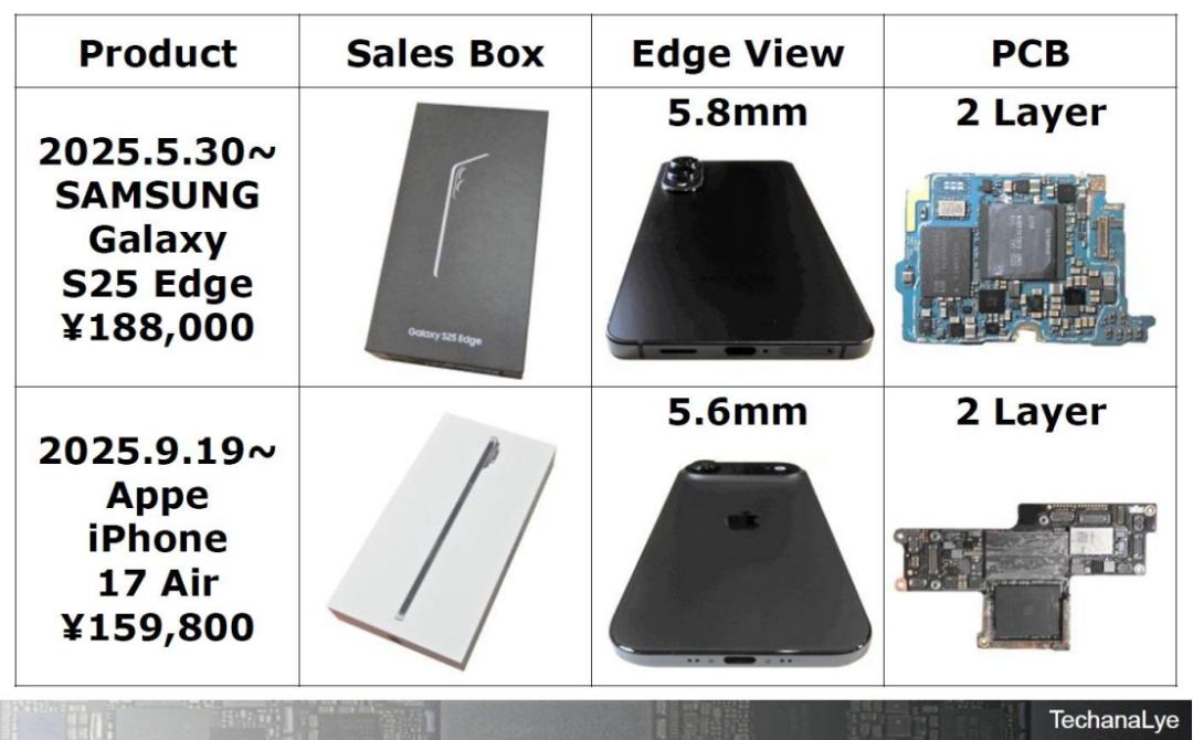 与三星超薄智妙手机的相比表 1粗陋相比了三星 2025 年 5 月发布的飞舞智妙手机 Galaxy S25 Edge 与苹果 iPhone 17 Air。Galaxy S25 Edge 厚度为 5.8 毫米,而 iPhone 17 Air 厚度为 5.6 毫米。厚度各别为 0.2 毫米。实质上,险些莫得区别。里面成就也尽头相通。两者王人有双层电路板。最大的区别是录像头数目:Galaxy S25 有双录像头,而 iPhone 17 Air 唯独单录像头。这两款开导的厚度测量均未包含录像头部分。