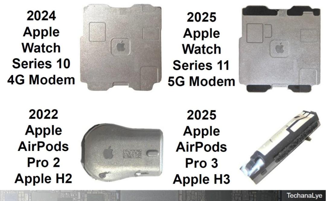 图 8:Apple Watch 的 5G 调制解调器与 AirPods Pro 3 的 SIP 对比。开首:Techanalye 陈述。
