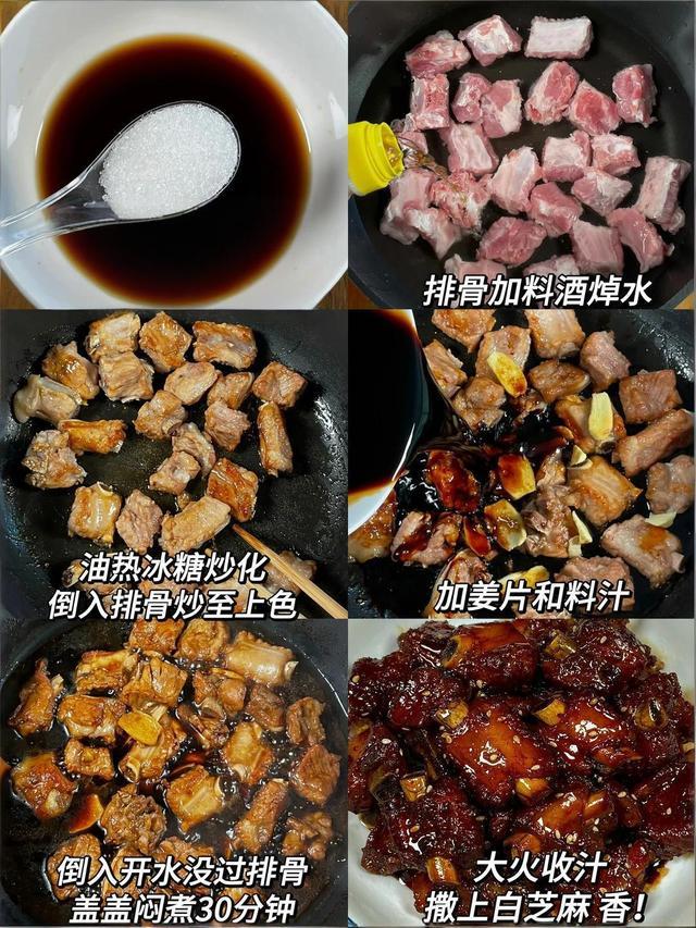 4.焖煮收汁:加入姜片和调好的糖醋汁,倒热水没过排骨,盖盖焖煮30分钟,大火炬汤汁收到浓稠,快收完放两圈醋,有青柠挤几滴进去,再撒点白芝麻,出锅!